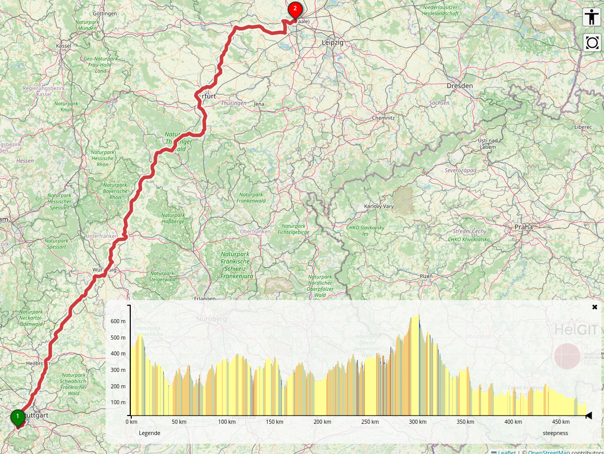 Strecke: Böblingen - Halle (Saale) (zwei Tage später das Gleiche zurück) inkl. Erhebung des Thüringer Waldes und der Buckel bei Heilbronn. Dann zwei Tage meine Arbeitsstrecke hin und zurück.