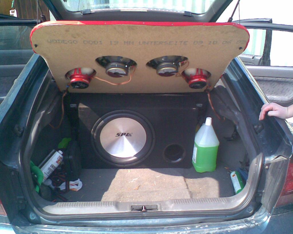 Auf der Hutablage sind Verbaut: 2x Infinity Reference (Weis nicht genau welche bezeichnung) und 2x Twister (auch keine ahnung, hab ich mal geschenkt bekommen.) Als Woofer hab ich eine Basskiste von SPL,mit einem 38 cm Woffer mit Doppelschwingspule auch von SPL. Die ist für mich mehr als ausreichend !!!