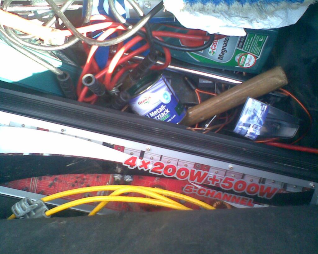 In der NICHT AUFGERÄUMTEN Reserveradmulde ist die SPL Endstufe die den Woofer und das Hecksystem anspielt Verbaut.