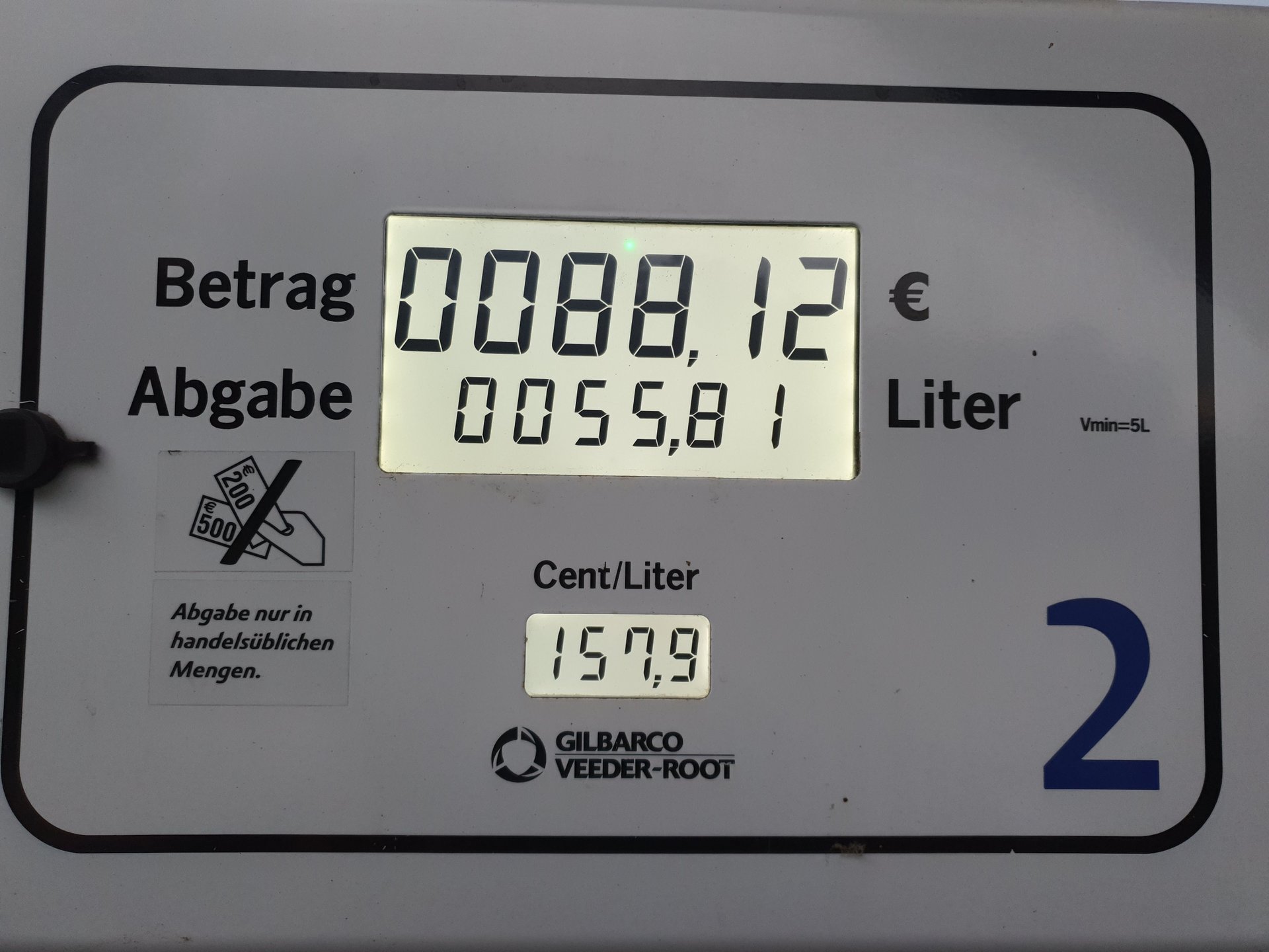 Wie man sieht, wurden von nominell 58,5l Tankinhalt 55,8l nachgetankt. (immer nur bis automatisches Abschalten der Zapfsäule)